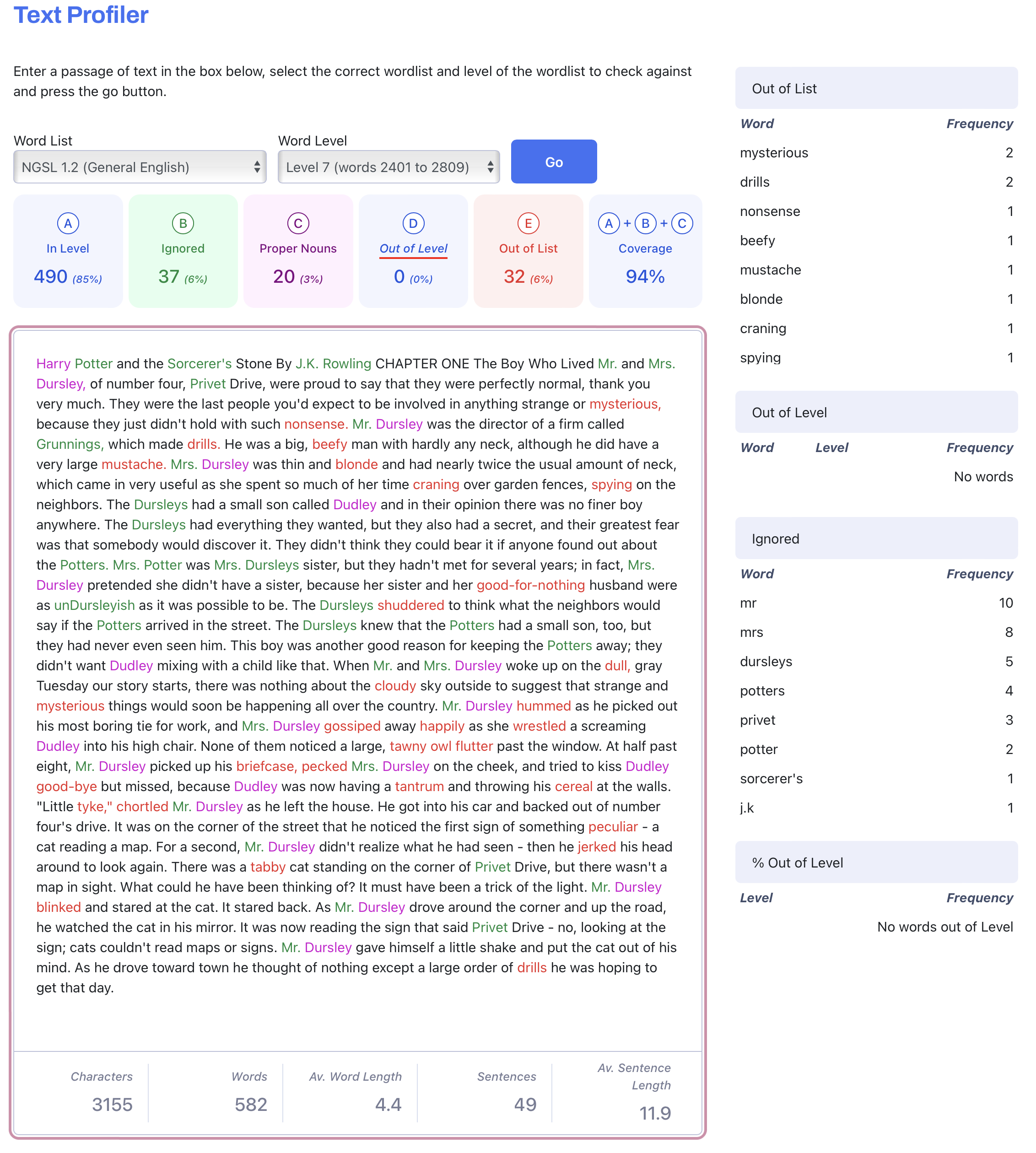 These types of profiling tools are often used by publishers to create graded reading texts for extensive reading programs or by researchers to establish the difficulty of texts, but with the NGSL Profiler, we have tried to create a more teacher-friendly version to help practicing classroom teachers to create, simplify or just simply gauge the appropriateness of a text for use in the classroom.